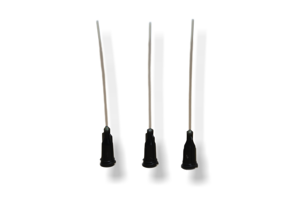 Loading... Please wait...The solid PTFE needle is available in 14g, 16g, 18g, 20g, 22g, 24g, and 30g and is shown below. Note that 22g is the standard size. All sizes are kept in stock. When you order 1, you receive 1 pack of 3 needles. Each needle is 2" long.